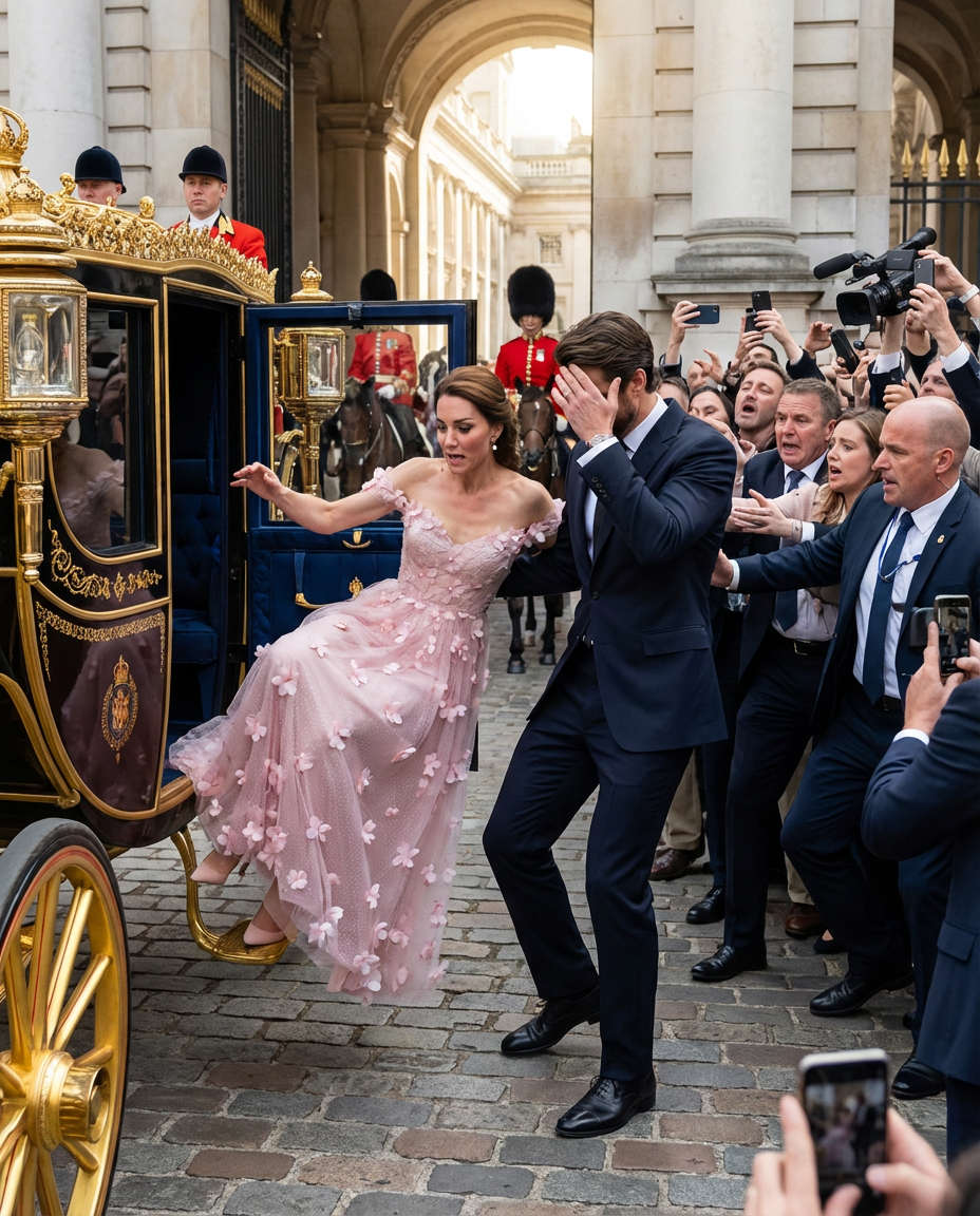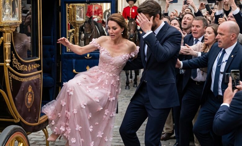On what should have been a festive day, the atmosphere was electric as Princess Kate arrived for a royal event. Dressed in a magnificent gown, she stepped out of the carriage, but in an instant, everything changed. Witnesses reported that as she lost her balance, gasps of astonishment echoed through the crowd. The suddenness of the incident created a palpable tension, causing many to fear for her safety.