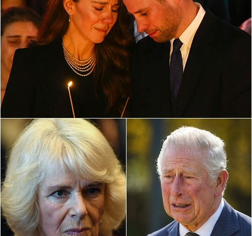 TRAGIC NIGHT AT BUCKINGHAM: Kate and William held each other in tears under the sorrowful candlelight. The Palace hall was sealed off from the press, as all royal members were summoned — except Harry. King Charles collapsed after a heartbreaking scream: ‘Camilla, my wife has…’”